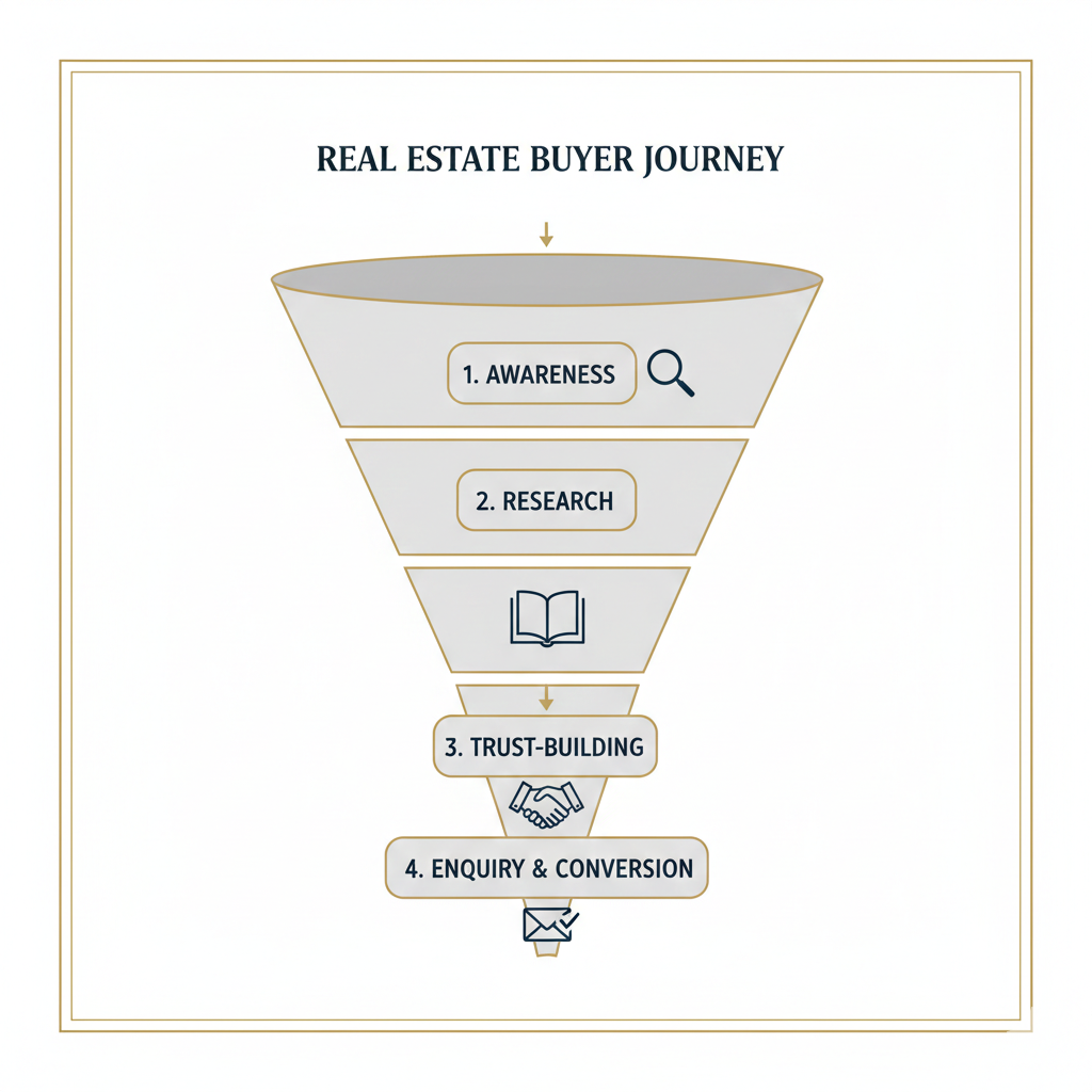 Calm, modern visual showing a real estate buyer journey funnel — awareness, research, trust-building, enquiry — with subtle icons, white space, and editorial design